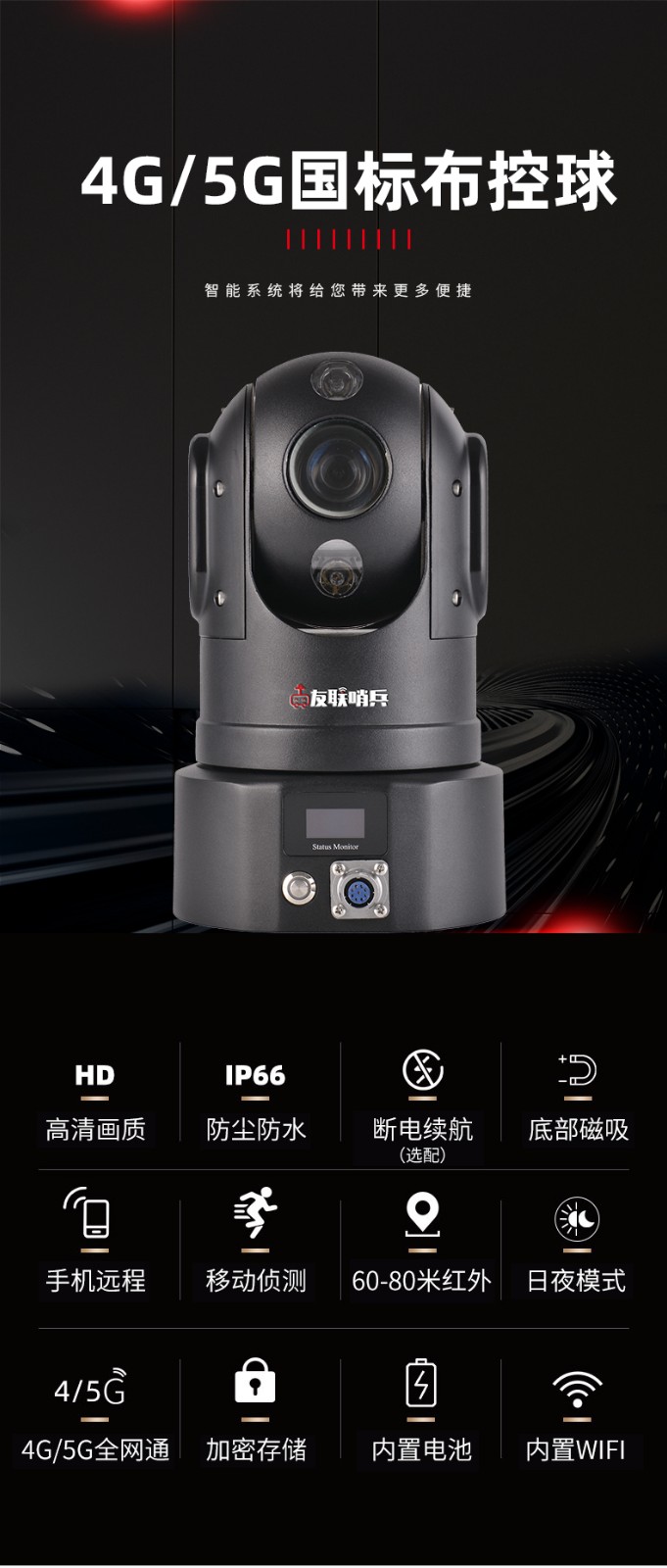 友聯哨兵4G高清布控球是一款功能全面、攜帶方便的無線視頻4G應急布控球產品,超高設備集成度,內置高性能鋰電池組,具備防水防震的特性,可滿足臨時布控和快速安裝的特殊要求。