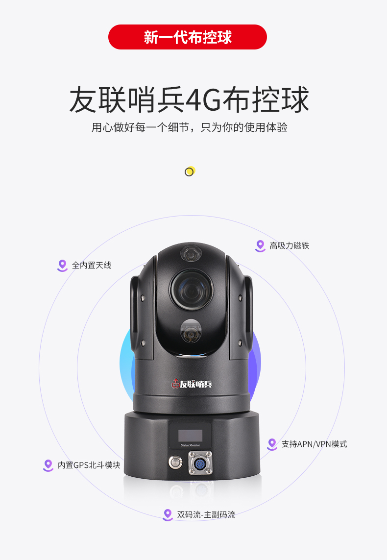 友聯(lián)哨兵5G高清布控球是一款功能全面、攜帶方便的無線視頻應(yīng)急指揮一體化產(chǎn)品,超高設(shè)備集成度,內(nèi)置高性能鋰電池組,外接高清顯示控制終端,具備防水防震等特性,可滿足臨時(shí)布控和快速安裝的特殊要求。執(zhí)行任務(wù)時(shí)可快速將設(shè)備臨時(shí)安放在需要監(jiān)控的位置或伸縮式三角架上,亦可直接吸附在車輛上,任務(wù)結(jié)束時(shí)可方便將設(shè)備拆下。適用于外勤執(zhí)法、偵查布控、安防安保、應(yīng)急指揮、搶險(xiǎn)搶修、巡線管理等行業(yè)應(yīng)用,比如公安、交警、消防、路政、城管、交通、法院、監(jiān)獄、林業(yè)、電力、水利、環(huán)保等單位。
