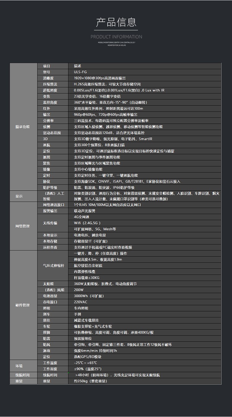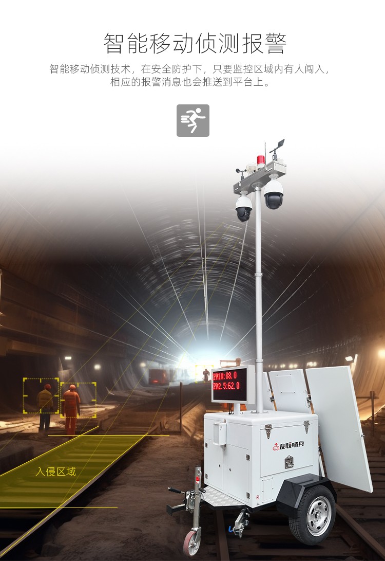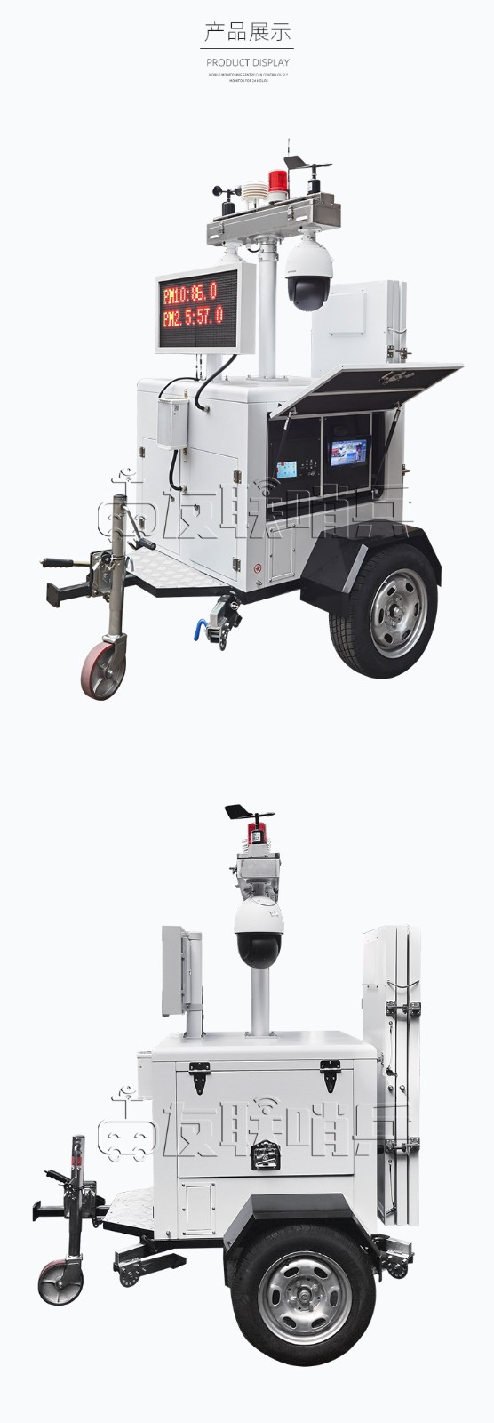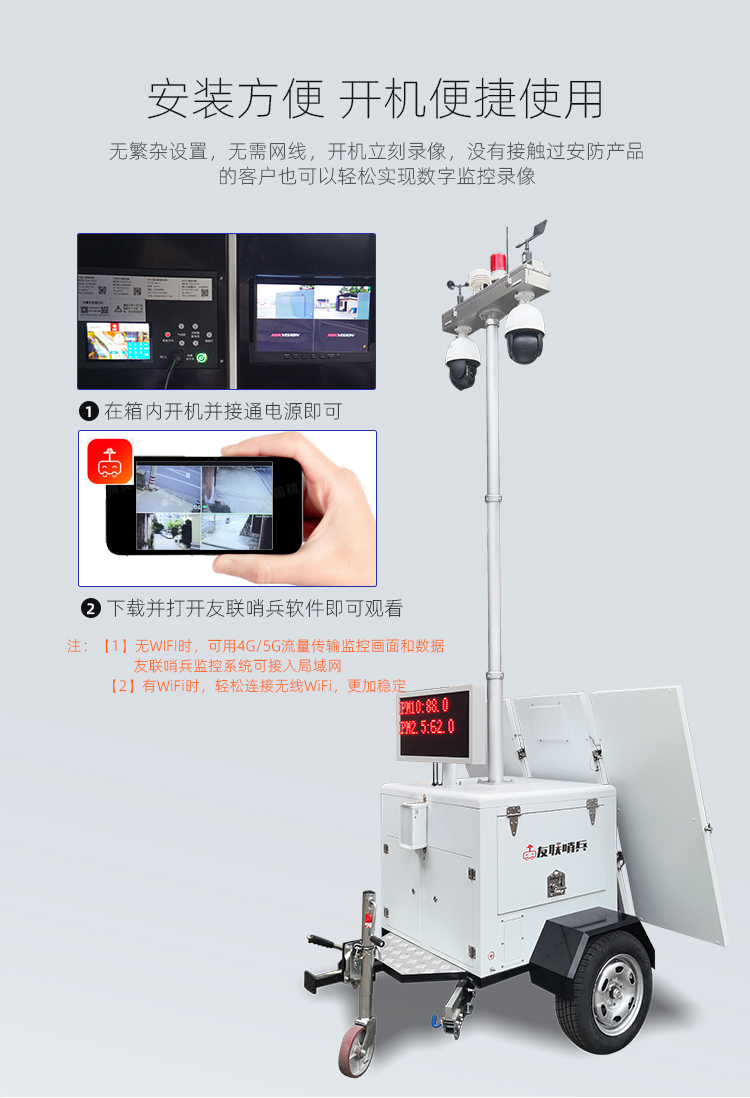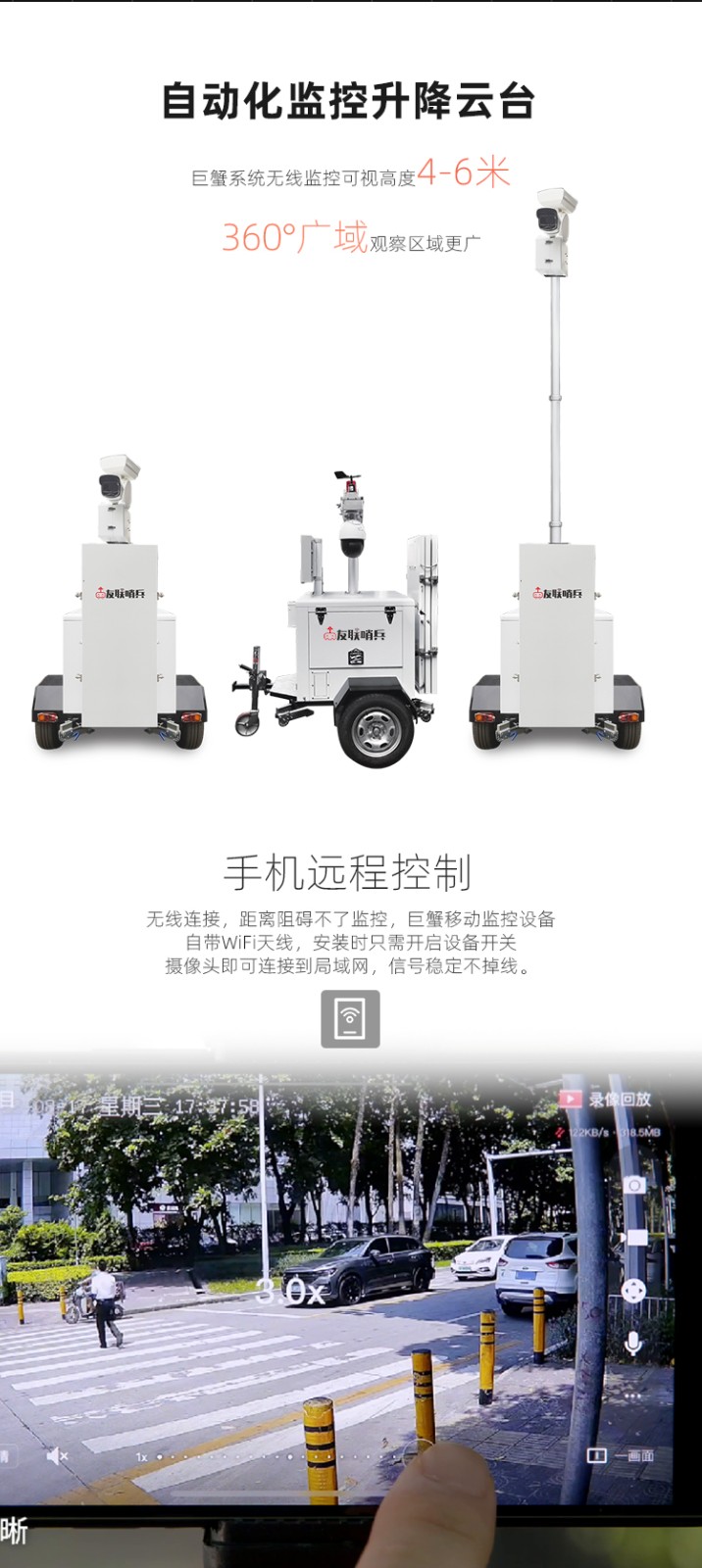友聯哨兵巨蟹款太陽能供電工地揚塵氣象監測移動監控車(系統),自帶網電,具備較高的機動性,系統可集高清視頻監控、照明、報警、廣播、對講、氣象環境監測(選配)、存儲、控制、無線傳輸、一鍵升降等功能于一體,并可具備市電、太陽能等多種能源補給方式,提升續航時間,以適應各類復雜的環境。戶外使用,不懼風雨。